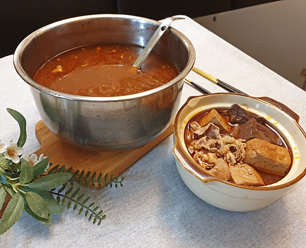 SUNNY則是把麻辣鴨血豆腐鍋跟黃金牛骨湯兩包加在一起煮