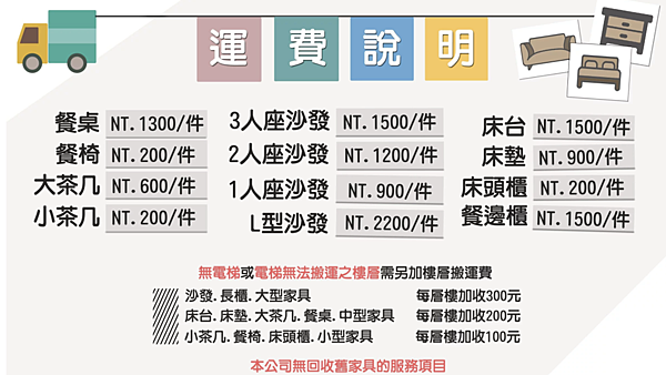 每種家具的運費價格,都有清楚標示,不用特地詢問店員也能知道,價格都是公開透明的。