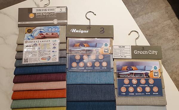 Sunny向服務人員詢問最受歡迎的布料種類,他向我推薦了這三種。分別是頂級涼感布 、 涼感貓抓布 、 高磅數貓抓布,每種布料都有許多顏色可挑選。這幾種布料各自的特色是什麼呢?