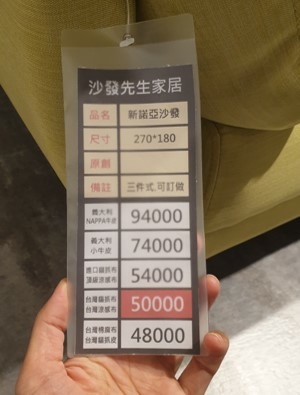 "沙發先生家居"每一座沙發的價格都標示在旁邊,包含尺寸也都清楚標示出,如果想訂製不同布料的話,價格也都有標示喔,非常清楚便利。