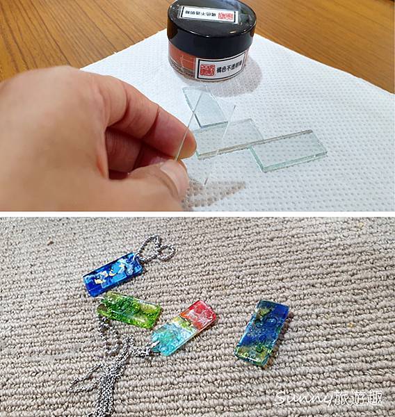 老師拿了幾個樣品給我們參考,透明的玻璃片要做成像下圖那樣美的飾品。