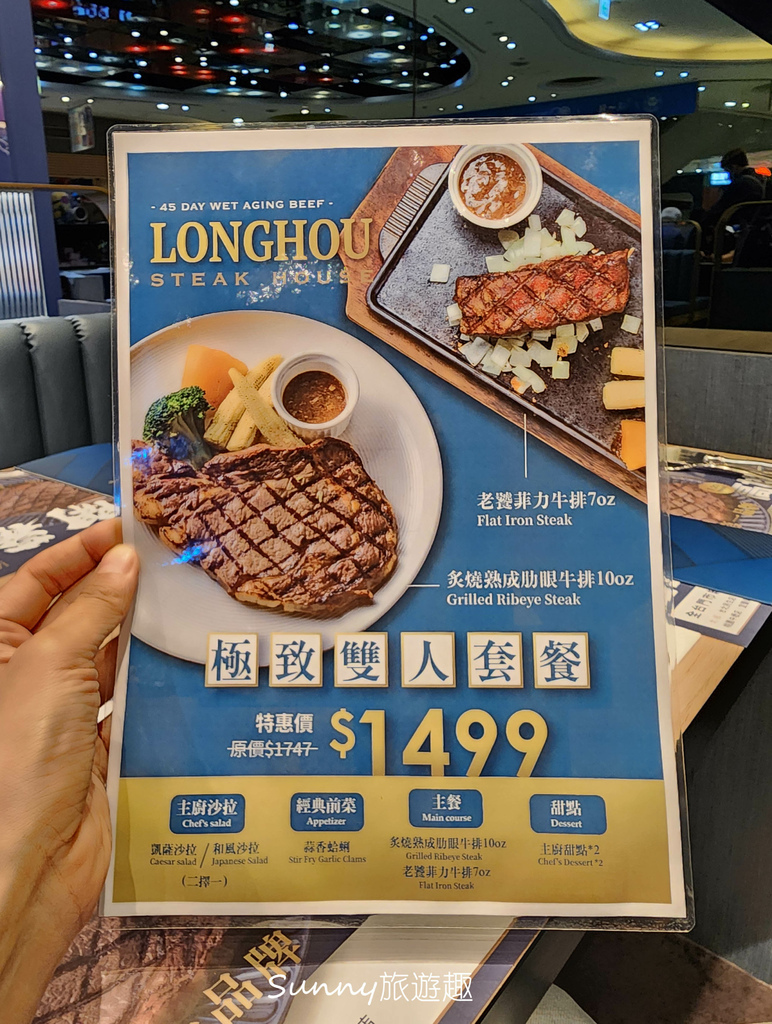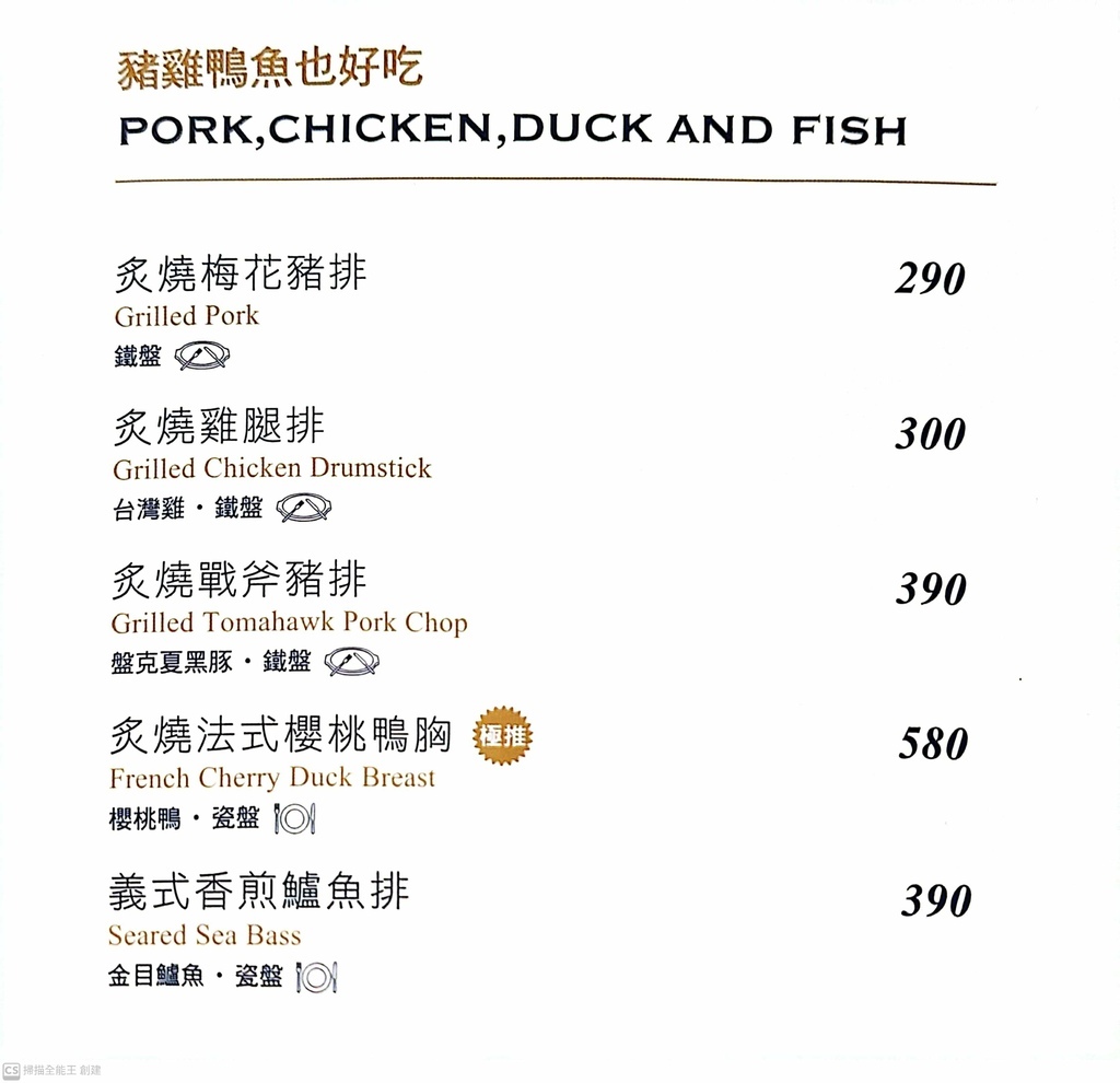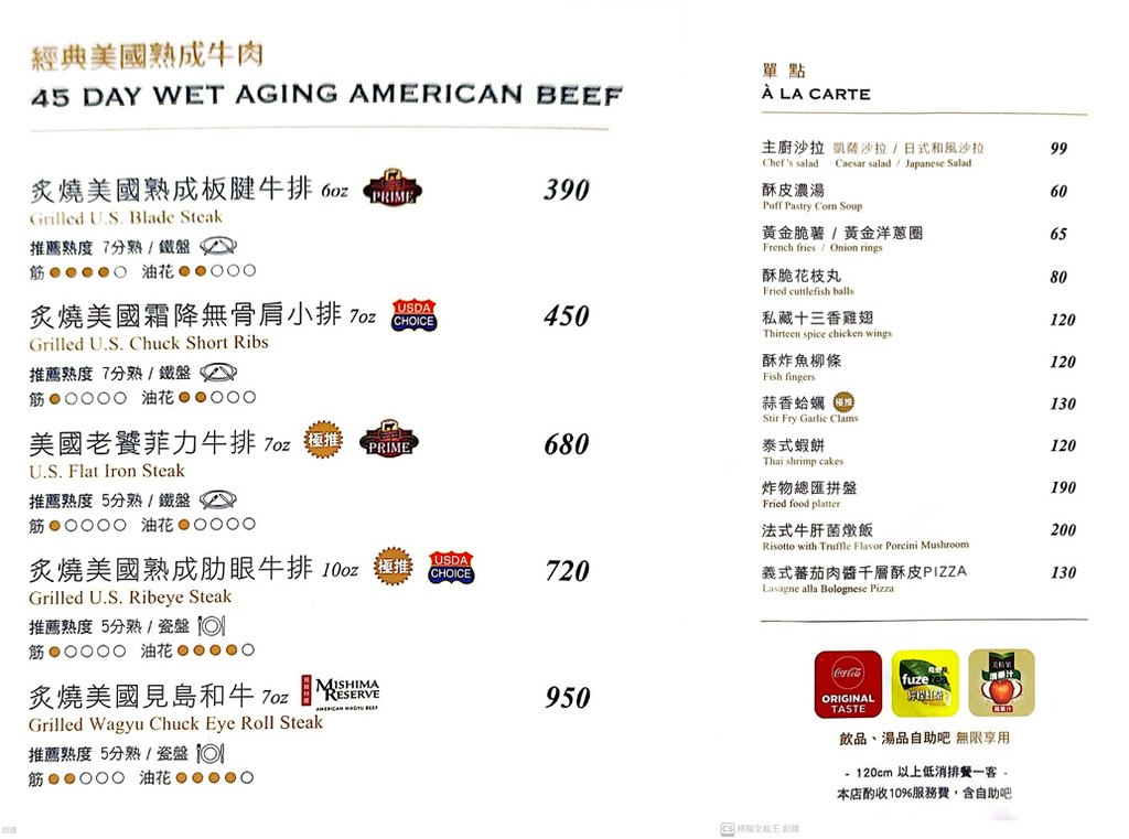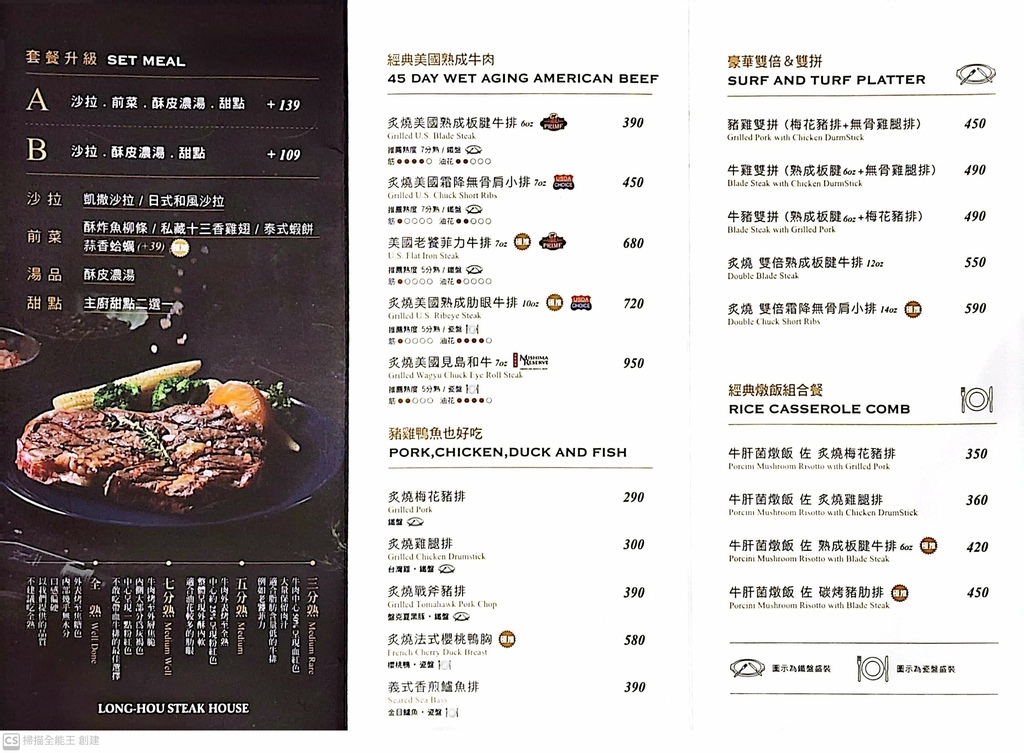 點餐方式可以單點主餐,再看是否升級成套餐,套餐有A、B兩種,主要差別在A多了前菜與甜點。這裡最經典的就是美國熟成牛排,但如果不吃牛的朋友,這邊也有豬、雞、鴨、魚多種選擇喔。
