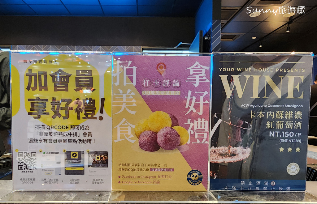 還有加入會員的集點活動,跟打卡評論送"地瓜球",喜歡吃牛排配紅酒的朋友,這邊目前有紅酒優惠喔! 原價189元,現在優惠一杯150元。