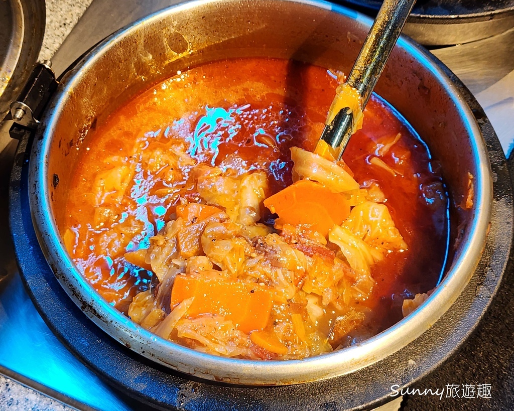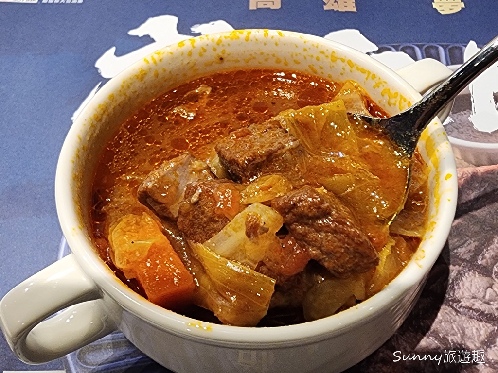 "羅宋湯"裡滿滿的高麗菜、紅蘿蔔之外、牛肉也超多,而且肉滿大塊的,色香味俱全。每一口湯中都能感受到番茄的天然酸甜,與蔬菜的清甜,還有蘊含在湯底的香料,讓人不由得閉上眼睛,細細品味這豐富層次的美味。