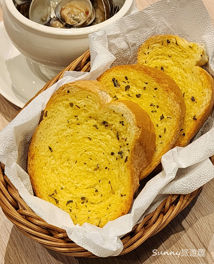 吃西餐最經典的還有"蒜香麵包",這也是我超愛的一種麵包。麵包表面烤得金黃酥脆,上面灑上了西洋香菜,麵包充滿濃烈的蒜香與奶油交織的香味, 外酥內軟的口感越嚼越香。