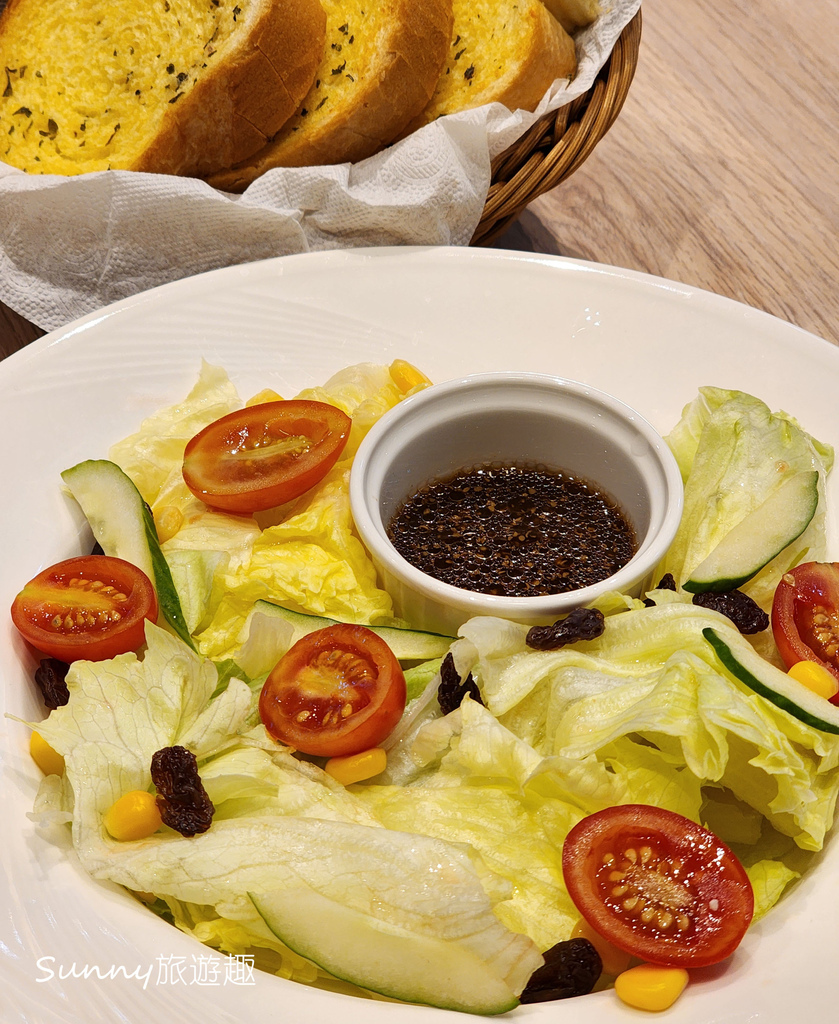 "和風沙拉"裡有生菜、小黃瓜、玉米粒、小番茄、葡萄乾,青菜看起來處理得很乾淨,和風醬味道酸甜清爽,沙拉吃起來非常爽口開胃。