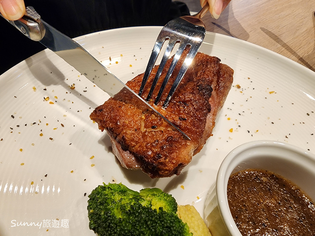 肉塊的部分份量不少,廚師真的好會煎,肉感覺有塗上醬汁再去煎烤 , 豬排表面焦香油亮 , 看起來好美味喔! 豬排的肉是有醃漬過的,本身已經有調味過,建議大家可以先吃原味,再去加其它調味料,不要急著先加鹽呦! 我個人覺得不用另外灑鹽已經很夠味。
