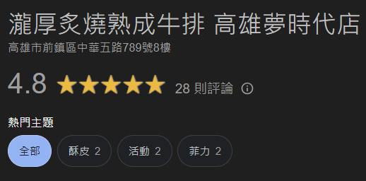 「瀧厚炙燒熟成牛排」在北部、中部有許多間店面,所有的店面谷哥評價都有4.5顆星以上,是一間評價相當不錯擁有好評的牛排館。