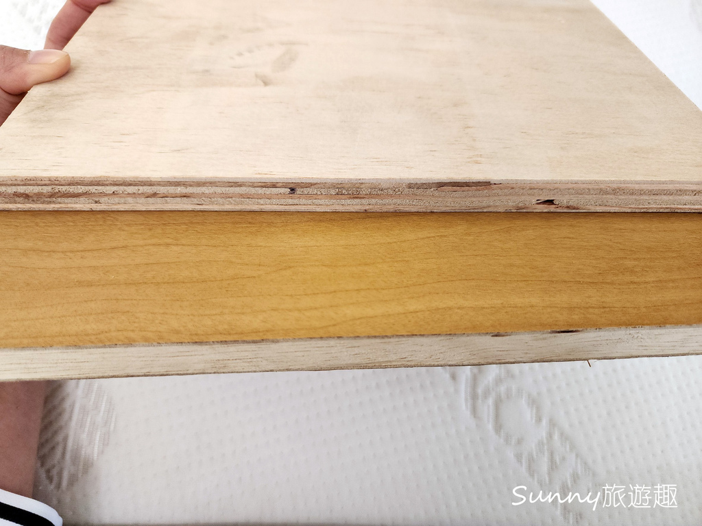 「熟晨床墊」的床架使用的材質是較厚的系統夾板 ,並考慮熱脹冷縮的影響,提供橫向和縱向交錯的板材設計,以增加承重穩定性,避免長期使用造成的凹陷。 (上方為熟晨床墊使用的板材,下面是他牌使用的板材)。