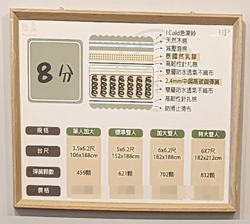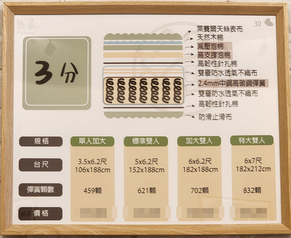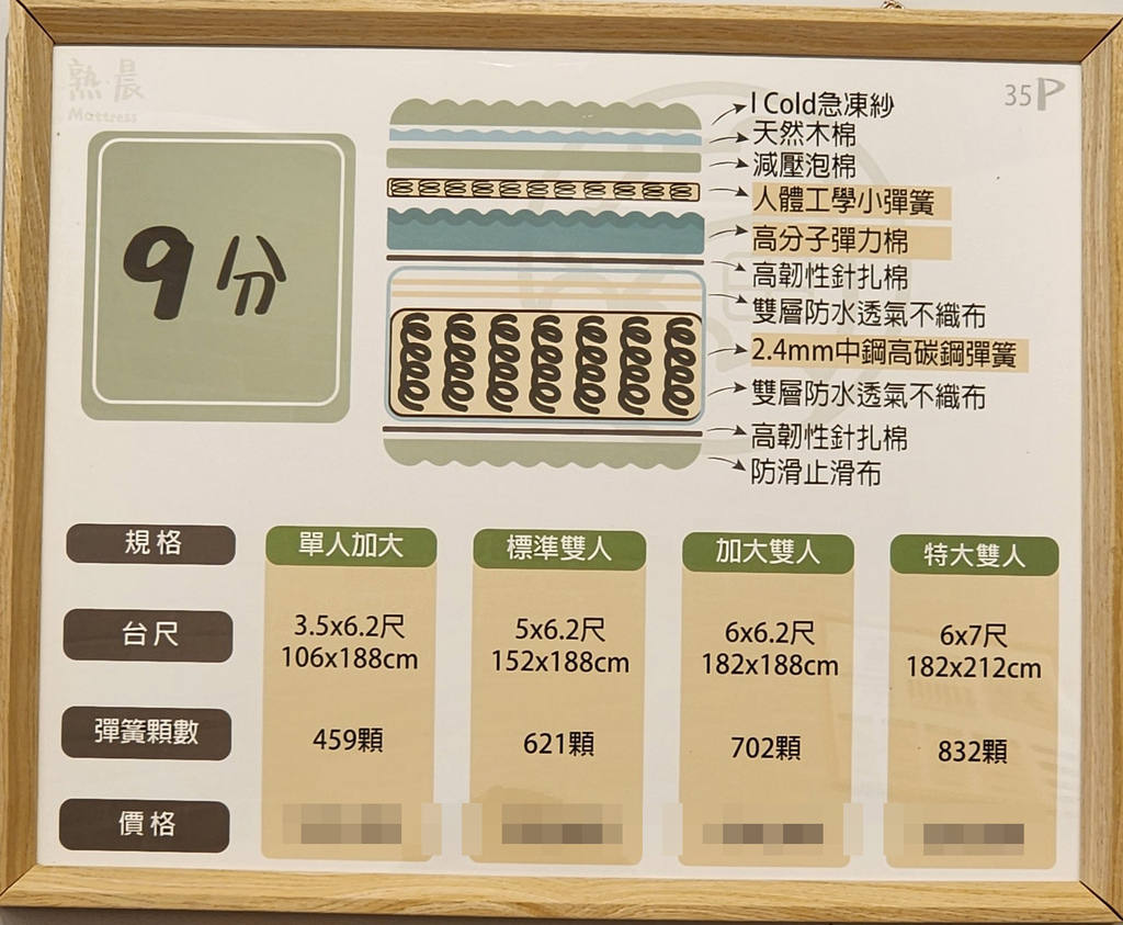 熟晨床墊販售的床墊有1.獨立筒床墊、2.獨立筒+乳膠床墊、3.乳膠床墊、4.高密度泡棉床墊 這幾款。床墊名稱以熟成牛排為發想,諧音取做熟晨床墊,九款床墊則用1~9分熟命名,很有趣! 每一款床墊的牆面上都有詳細的海報介紹。