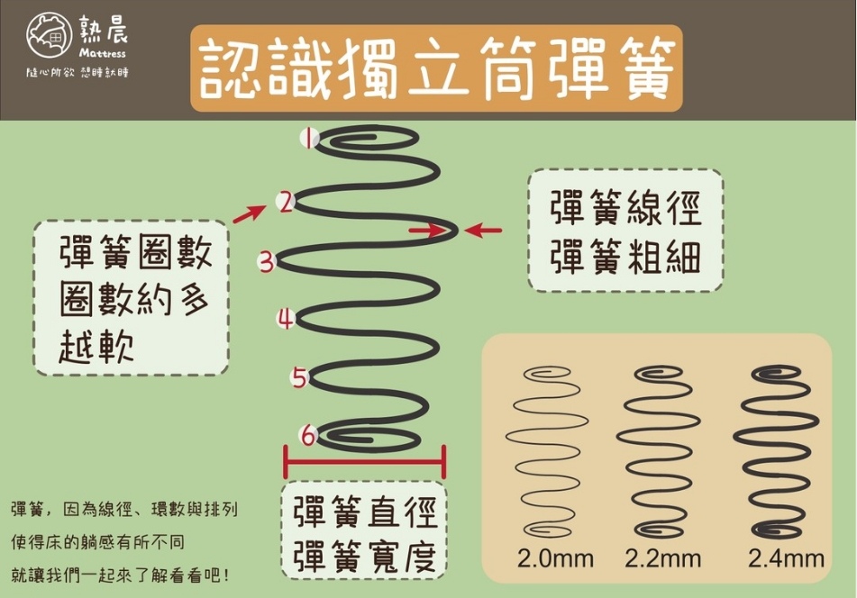 「熟晨床墊」提供了九種不同的軟硬度床墊,使用三種不同粗細的彈簧線徑 (2.0、2.2、2.4) ,主要區別在於直徑和支撐力。彈簧線徑粗細搭配不同圈數都會影響躺起來的軟硬度不同喔!