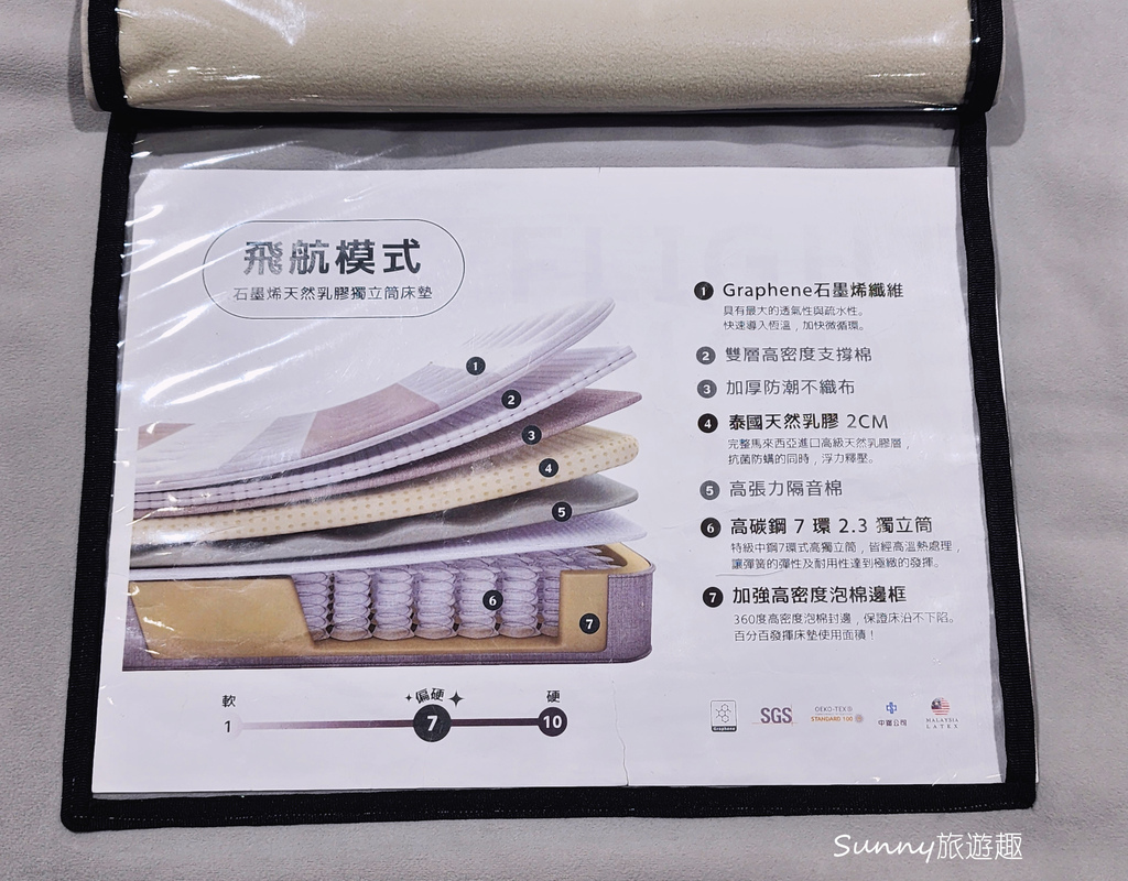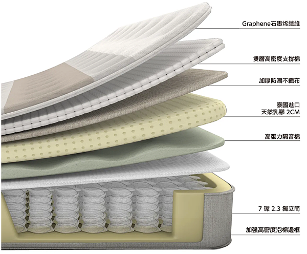 這款床墊軟硬度 1~10(硬)評量的話在7。 這款也是屬於偏硬的床墊,比較特別的是使用石墨烯表布,這材質具有高度的透氣性與疏水性,能快速導入恆溫,加快微循環。