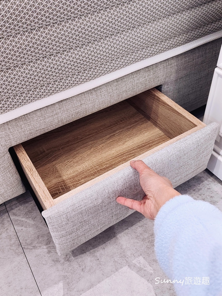 還有懸浮造型的實木床架,我個人滿喜歡這種設計的,退縮的床腳讓床架遠遠看起來像是懸浮著的感覺,感覺很現代,我個人覺得也比較不會踢到腳XD。