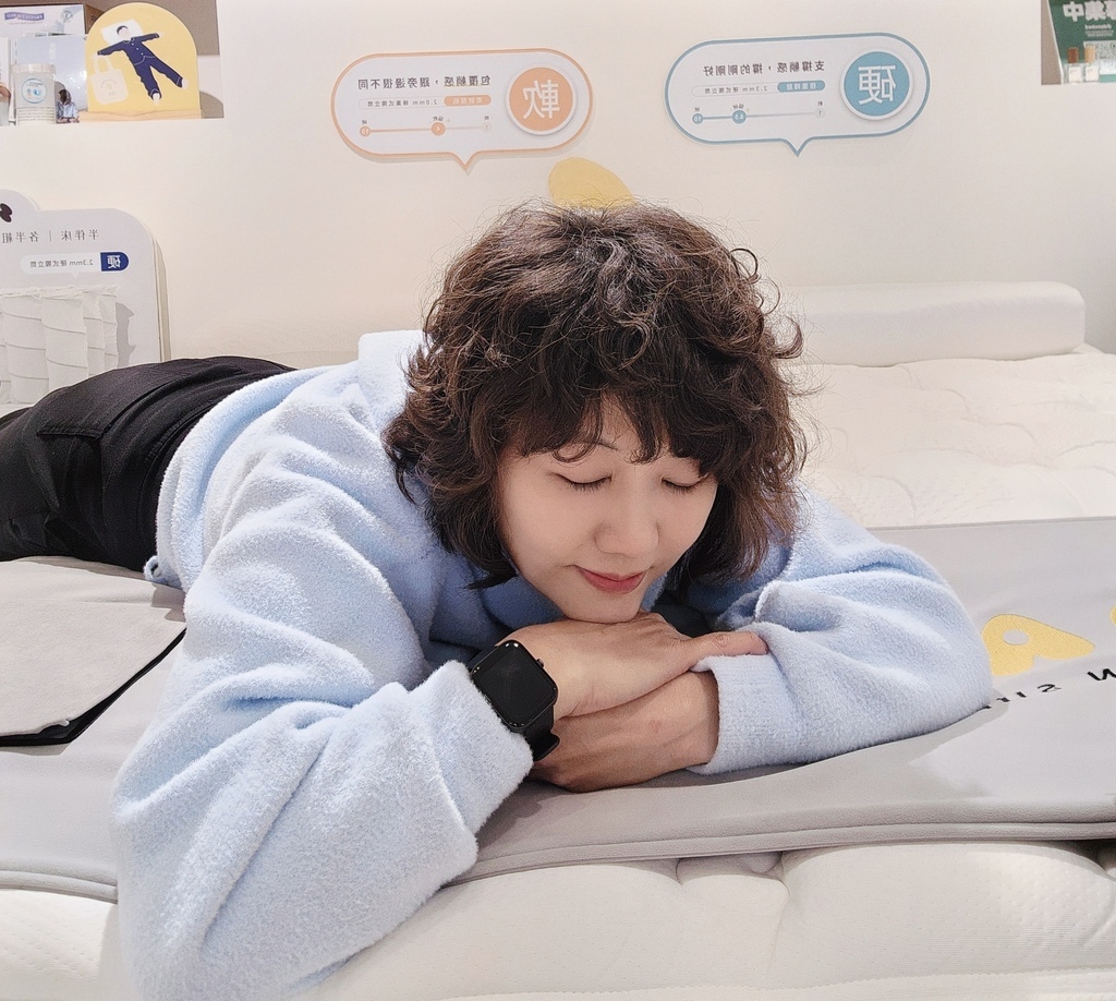 接下來分享我試躺的感受。我個人最喜歡的是省電模式、極光這兩款床墊,讓我這個緊張不易放鬆的人,躺著躺著居然有股濃濃的睡意! 厲害了。