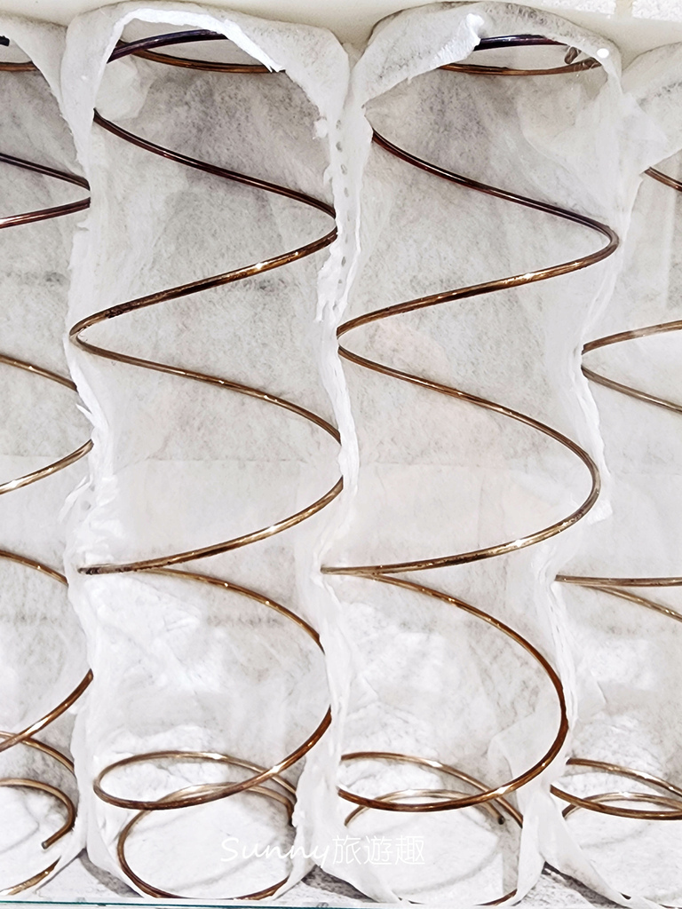 有別多數一般床墊使用中鋼彈簧,這張床墊使用的是AGRO 的鈦銅鋼(TiCuS)獨立筒彈簧,是一種經過特殊製程的彈簧材料,具有耐疲勞度高(添加微量鈦元素,提升彈簧的耐用性,延長使用壽命) ,抗腐蝕性能佳(表面鍍銅處理,有效防止生鏽,適合潮濕環境)的優點特性。 頭一次看到這種彈簧感覺好高級!