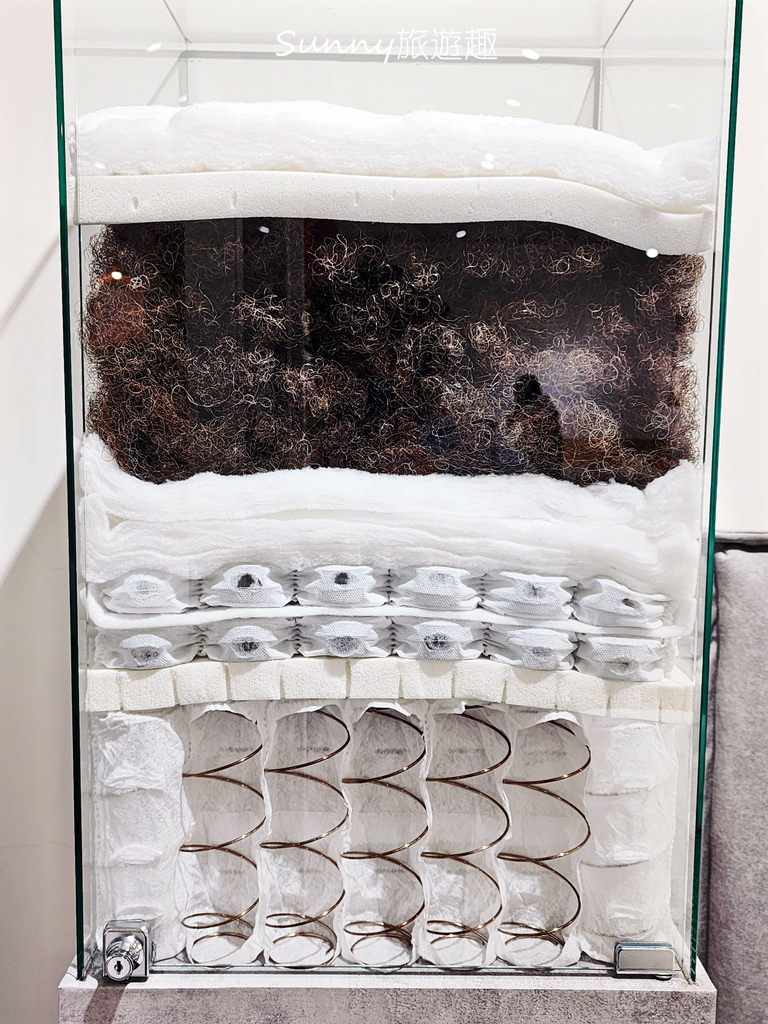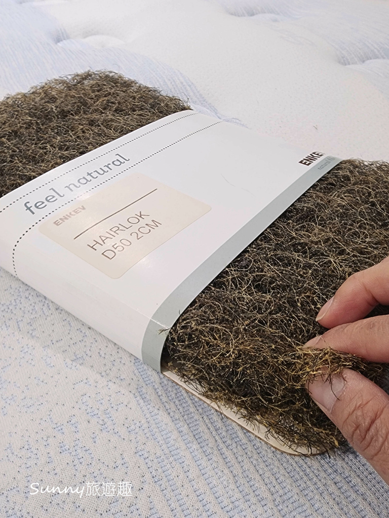 現場還有展示馬毛,以往我只聽過這種材質,頭一次親自摸到,摸起來有點硬硬,壓下去的時候感覺Q彈的。這張床墊躺起來的確如同硬度標示,明顯偏硬,不會不舒服但比較不是我的菜XD。