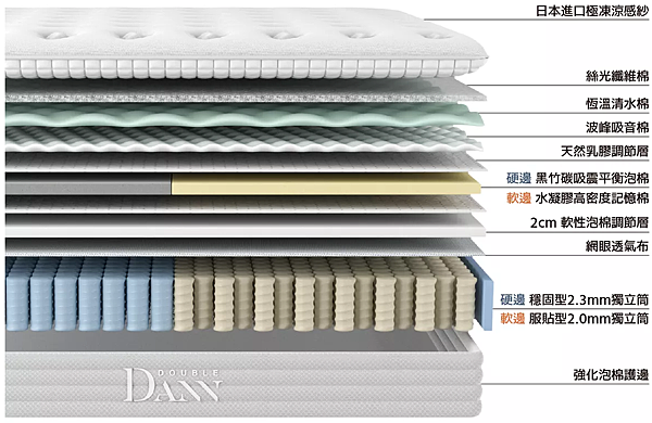 硬的那邊:使用黑竹炭吸震平衡泡棉,躺感扎實、支撐佳。以及穩固型彈簧,線徑 2.3 mm , 韌性高、支撐力強。