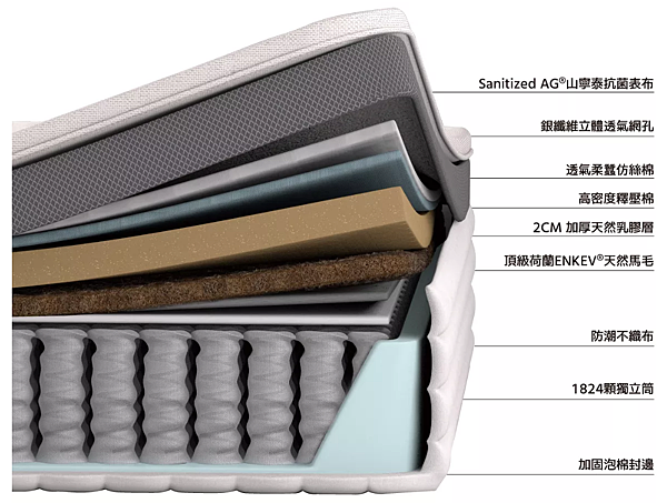 這款我覺得以材質來說,滿適合比較會流汗的人或住在比較潮濕地區的人,山寧泰抗菌表布,長久保持床墊不受黴菌,塵蟎傷害,也滿適合長輩,偏硬的床對他們來說比較好起身。
