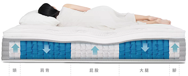 ● 五段落式獨立筒床墊針對身體提供不同支撐力,使用不同的彈簧(線徑1.8mm / 2.0mm),貼近身體各部位需求。