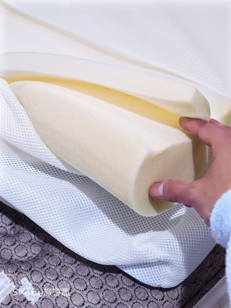 還有內含2公分調節墊,可以自行調整高度,滿特別的設計。清水棉有透氣性良好、吸濕排汗、耐用性佳等優點,但重量非常的重,打枕頭戰的話很難拿起來但可以一擊擊倒對手哈哈。