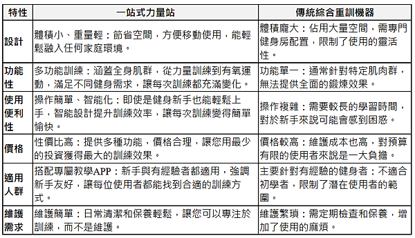 但一站式力量站改良了這些缺點,重量相對輕很多(機器20KG重),體積也小非常多(小於 0.4 平方米),重點是價格也親切不少。如果你是健身新手,不太清楚這兩者的差異的話,Sunny簡單的做了個表格可以參考。