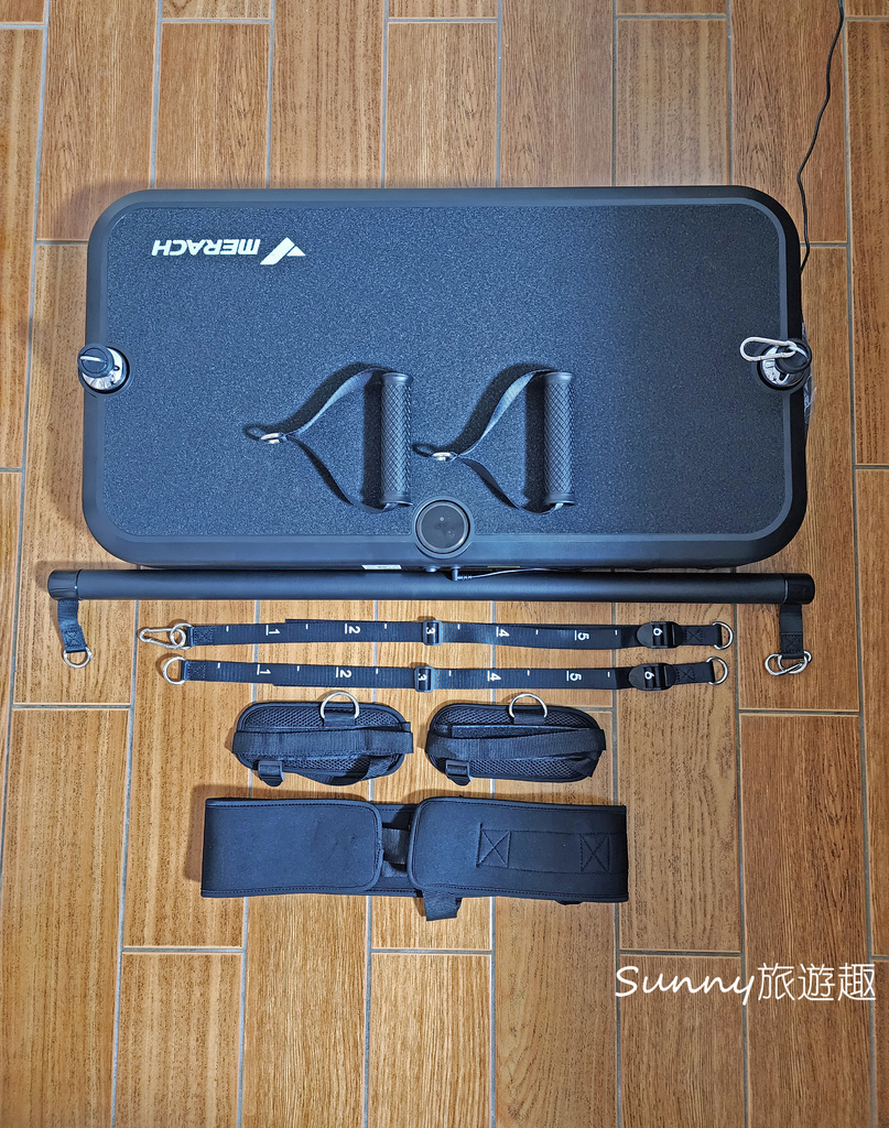 除了器材本體之外,搭配的配件很齊全,有握把、腰帶、腳踝綁帶、長桿、輔助延長繩,可以運用這些配件作不同的訓練。機器完全不用組裝,只要搭配配件就可以立刻使用,不用組裝這點我個人大大給讚。