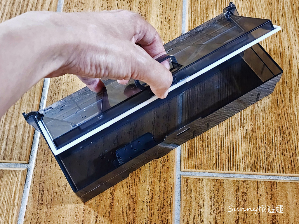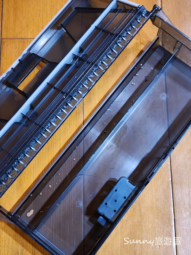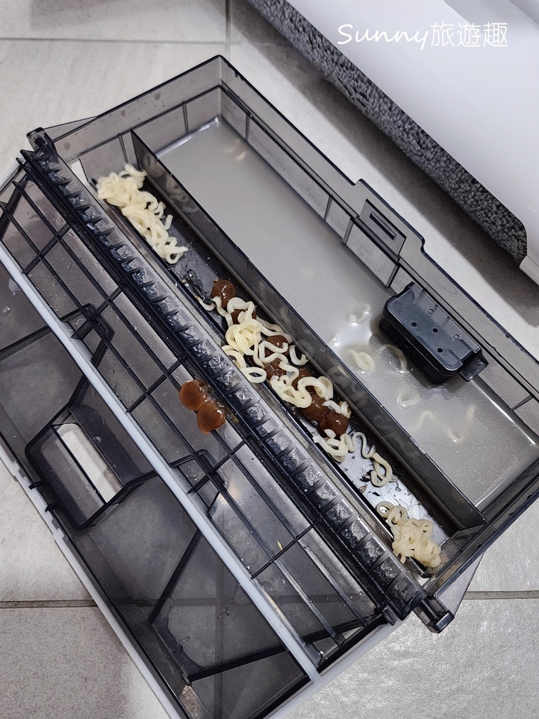 清潔效果很好耶! 那以後這種任務就交給你了喔,親愛的洗地機哈哈哈,打開汙水箱一看,固體與液體髒污都有確實分離。