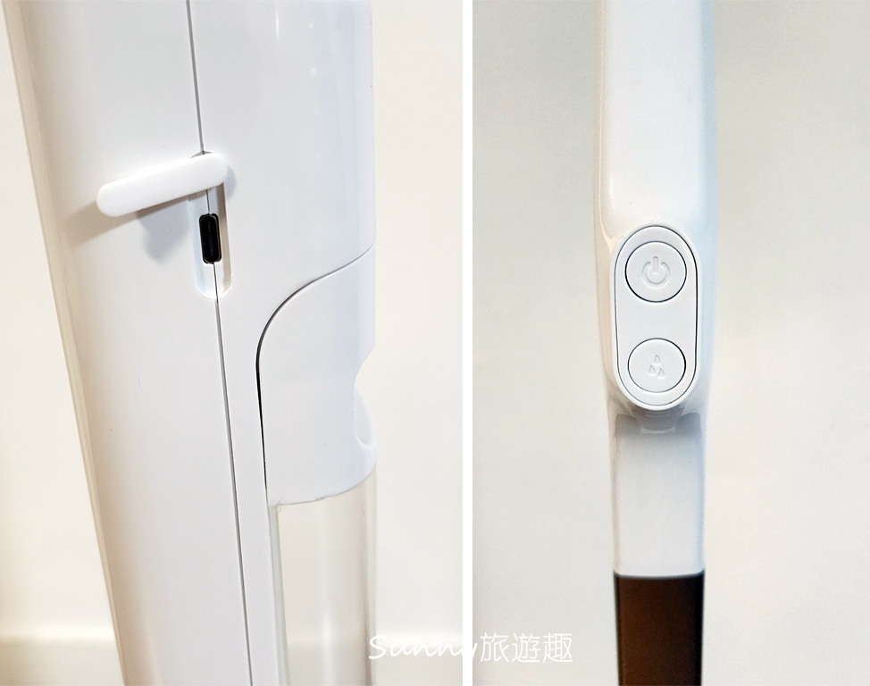 第一次使用時記得先把電充滿喔,充電孔在機身側邊(下方左圖),使用USB-Type C充電線。按鍵也很簡單只有兩個(下方右圖),懶人機器的設計我覺得操作要簡單跟直覺化也很重要。