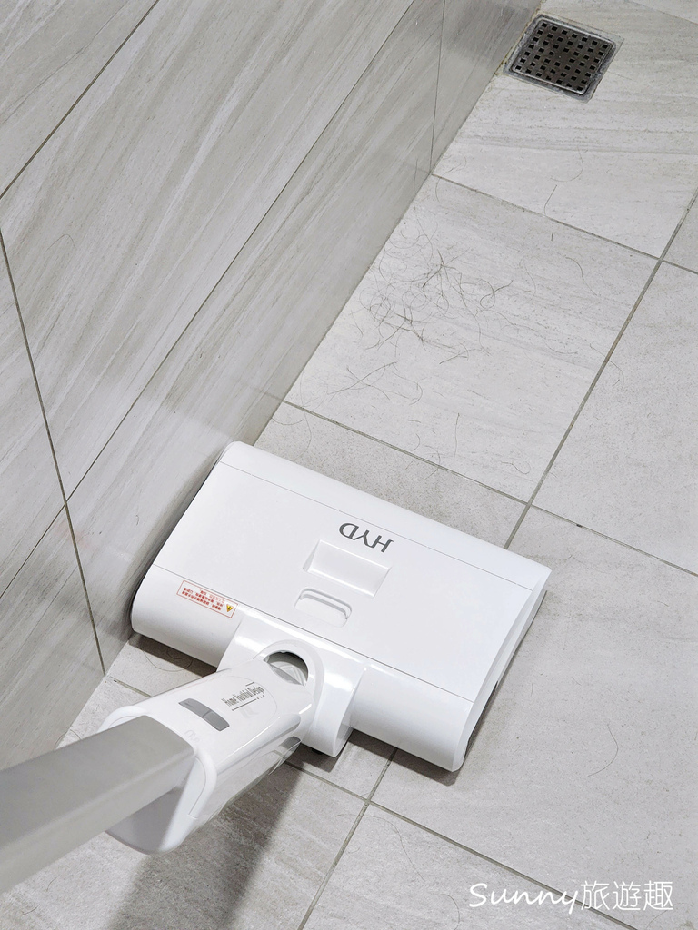 清潔比較多毛髮的時候,Sunny建議可以開啟強力模式,效果會好一點,但如果毛髮不多並且分散的話,一般模式就OK,測試毛髮多且集中的話,會需要來回多吸幾次,毛髮會稍微有點在滾刷處,但整體來說還是能清除掉浴室地板的毛髮。