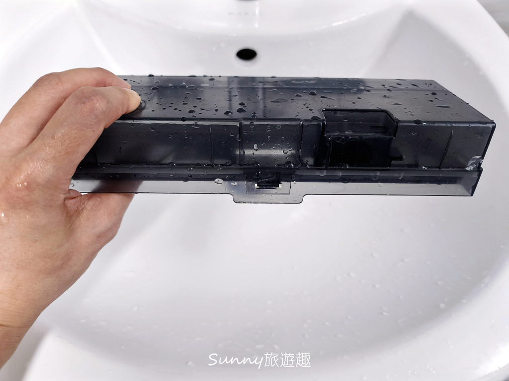 汙水箱的蓋子有出水口設計,可以把汙水箱反過來將液體先倒到水槽,液體清完之後在將乾的固體髒汙倒到垃圾桶中。