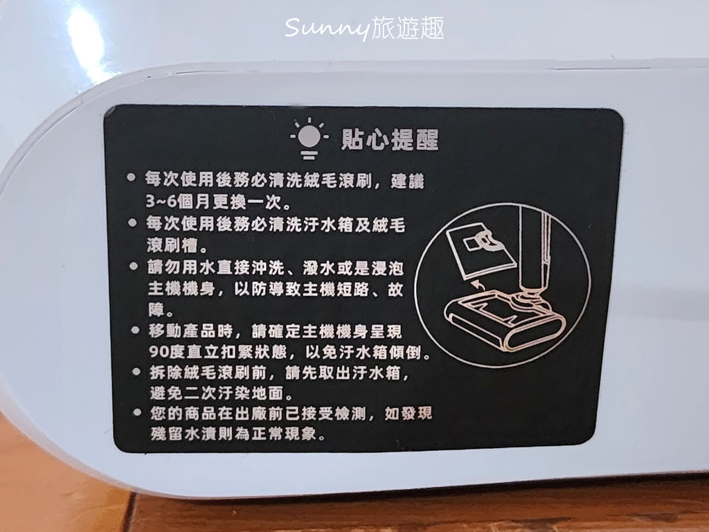 有一些使用的重要提醒,有貼貼紙在洗地機身上提醒使用者,切記移動時一定要先將把手的部分90度扣緊,不然汙水箱裡的水會漏出來喔!