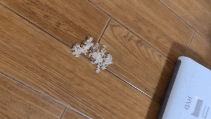 再來測試打掃房間,房間的地板的小屑屑跟少量毛髮都有清除掉,毛髮少量且分散時,就比較不會纏繞在滾刷。