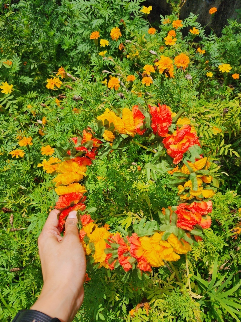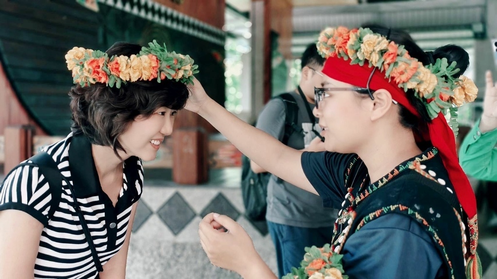 那一圈圈亮眼的橘色花可不是隨便挑選的喔, 是部落裡常用的萬壽菊, 萬壽菊在魯凱族文化中象徵著健康、長壽和平安,這種花色鮮豔,不僅好看、還能耐曬, 即使戴一整天下來花也不會垂頭喪氣,是迎接貴客、舉辦結婚、重要祭典時才會出現的祝福之花。 頭上戴花圈就是希望把這份祝福戴給賓客。