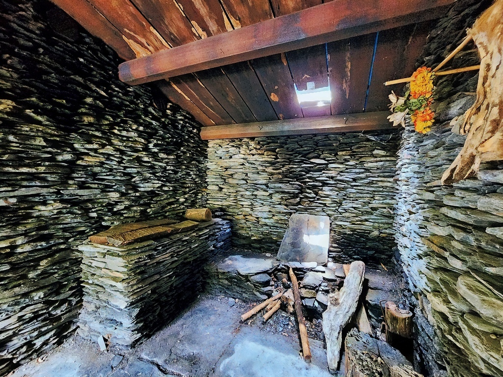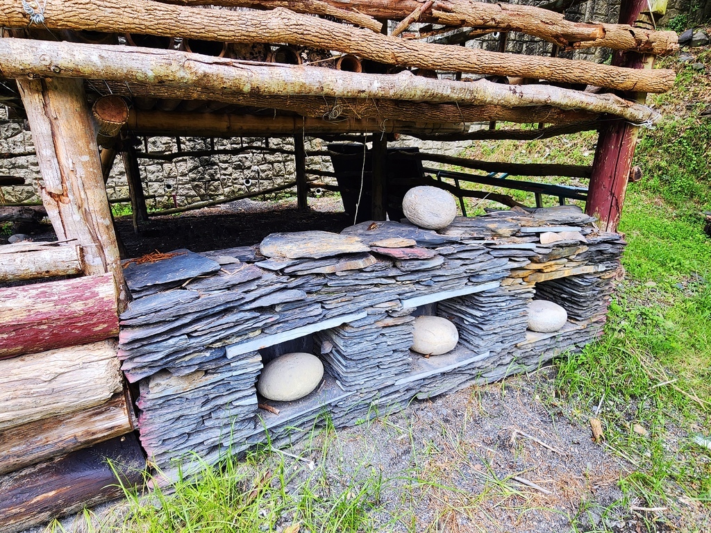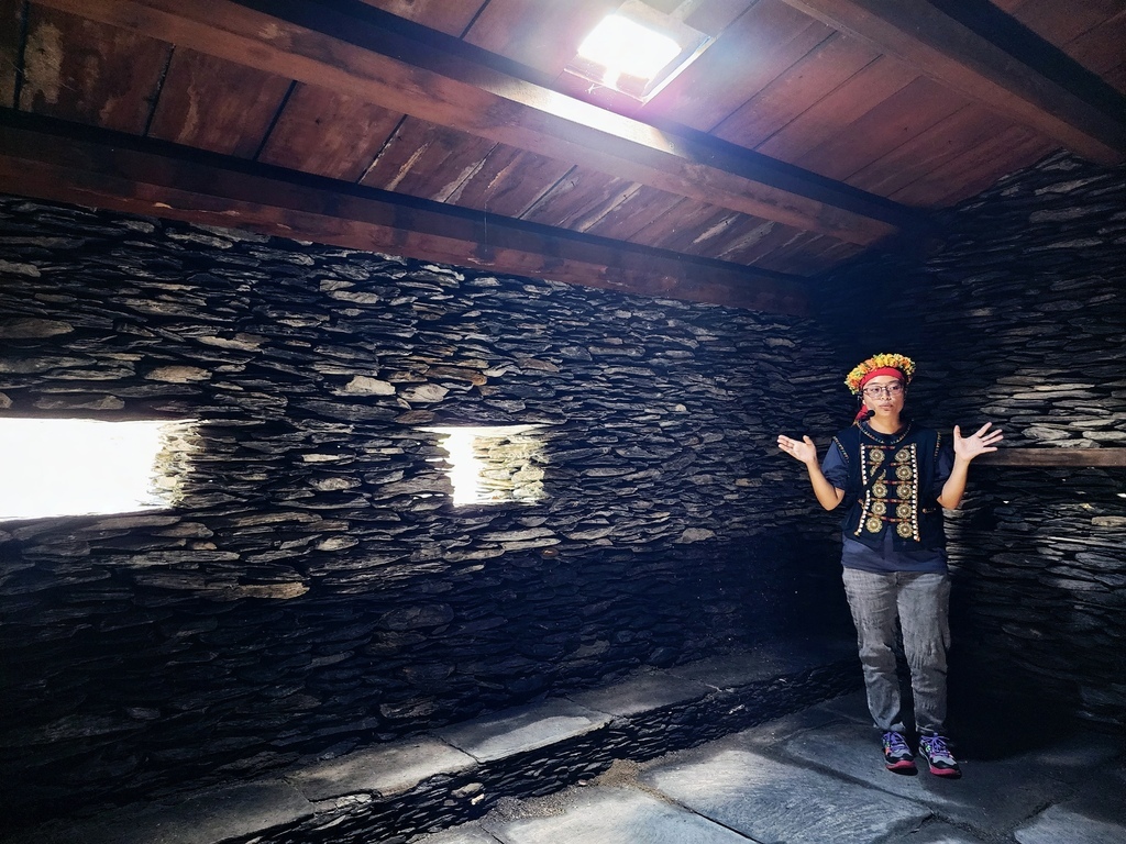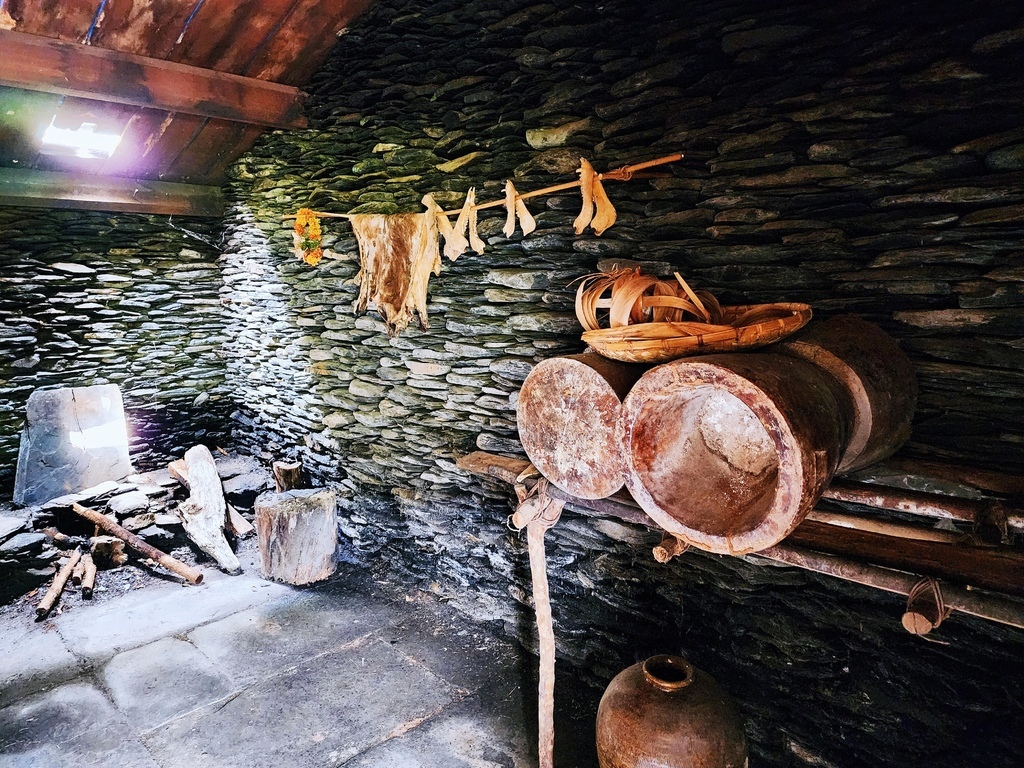 石板屋的格局很簡單,走進去之後會先看到廚房區,另一側則是臥室兼客廳的空間,算是傳統的一屋兩室設計。不大但很實用。我一邊聽導覽。一邊在腦內開啟模擬畫面模式。試著想像過去族人是怎麼在這個空間裡煮飯、生活、聊天的,有一種身歷其境的感覺。