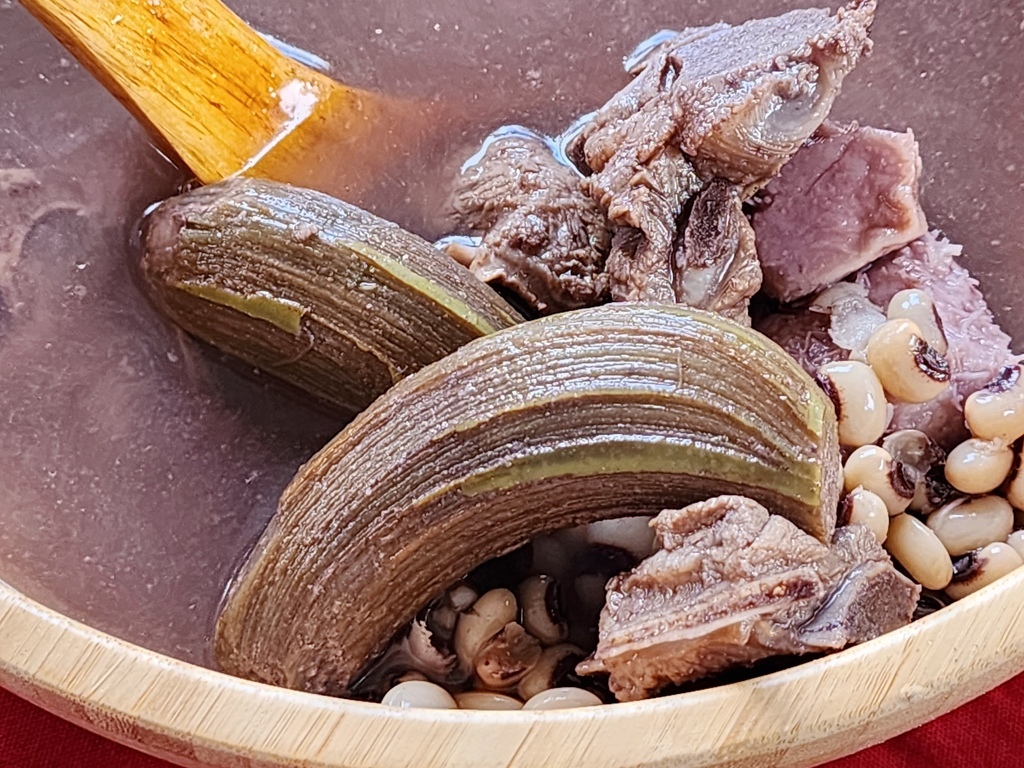 其中這道湯! 大大引起我的好奇,一舀起來!湯裡竟然有香蕉!而且不是甜湯是鹹湯,裡面放的是青香蕉,青香蕉加進湯裡和芋頭、山豬肉或排骨一起煮,能增加湯的濃郁感,還讓口感變得厚實,吃起來滑順像芋頭一樣柔軟但不糊,真的非常特別! 下次來這裡玩的話,別錯過體驗看看喔!