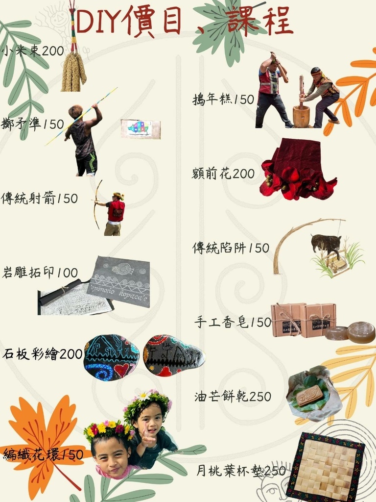 來到部落裡除了可以聽到許多有趣的故事之外,還有許多有趣的DIY體驗,可以更深入的親自感受原住民朋友們的生活! 體驗項目多元豐富,大人小孩都有適合的活動可玩。(如想體驗記得需要提前預約喔)